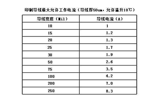 銅線的寬度應根據(jù)其能承載的電流進行設(shè)計。銅線的載流量取決于以下因素:線寬、導線厚度(銅鉑厚度)、允許溫升等。下表給出了銅線寬度、導線面積和導電電流(軍用標準)之間的關(guān)系。根據(jù)這一基本關(guān)系,可以適當考慮導線寬度。